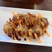 Octopus dumplings, topped with takoyaki sauce, mayonnaise, and bonito flakes.
